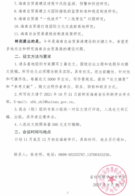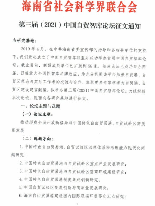 为集聚更多的专家学者为自贸港、自贸区建设建言献策,海南省社科联(社科院)拟于11月底12月初召开第三届(2021)中国自贸智库论坛,现面向各研究基地进行征文,请各单位、各部门积极组织相关老师和研究人员踊跃投稿。