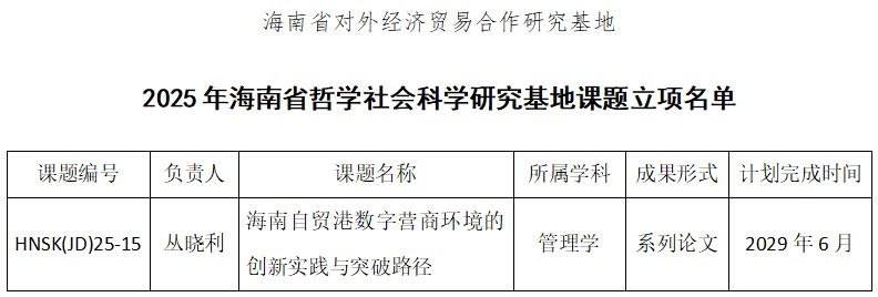 经海南省社科联组织专家开展评审、省社科联党组审定,并经网上公开向社会进行公示,我院(基地)推荐报送的丛晓利老师主持的课题“海南自贸港数字营商环境的创新实践与突破路径(HNSK(JD)25-15)”喜获立项,基地将根据学院相关文件规定给予经费支持以开展项目研究。