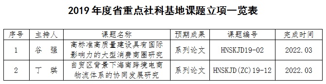 根据省社科联《关于申报2019年海南省哲学社会科学规划课题的通知》和《海南省哲学社会科学重点研究基地建设管理办法(试行)》(琼社科[2014]4号)、《海南省哲学社会科学规划课题管理办法》(琼社科[2014]58号)等文件要求,我基地向省社科联推荐申报、参与2019年度省重点社科研究基地课题评审了9个项目。经省社科联组织专家匿名初评、复评,并经省社科联主席团终审,我院谷强主持的“高标准高质量建设具有国际影响力的大型消费商圈研究”(HNSKJD19-02)和丁琪主持的“自贸区背景下海南跨境电商物流体系的协同发展研究”(HNSKJD(ZC)19-12)2项课题喜获立项。本次全省共有14项基地课题获立项,其中资助项目11项、自筹项目3项。