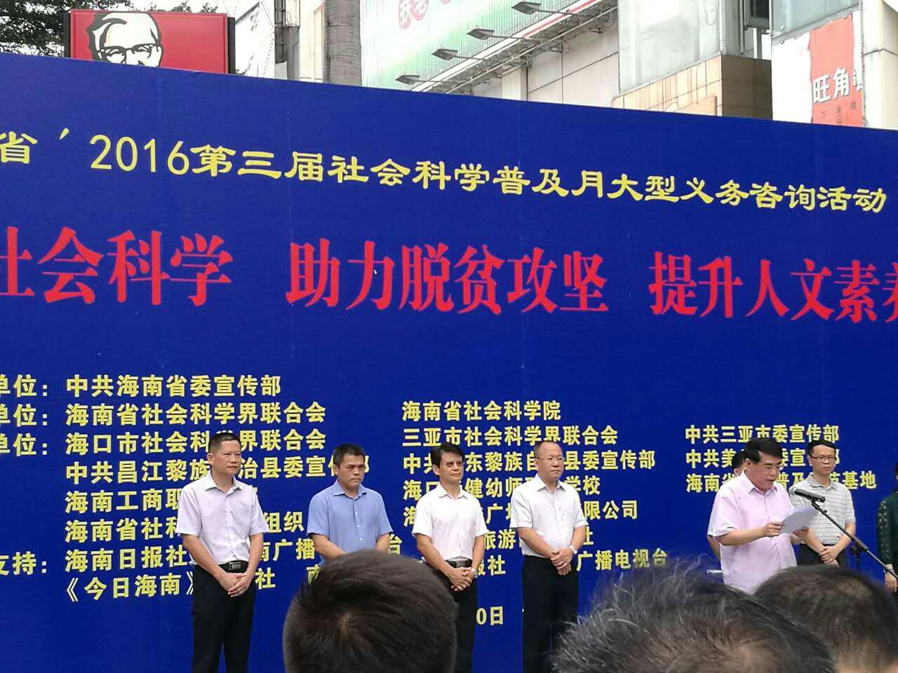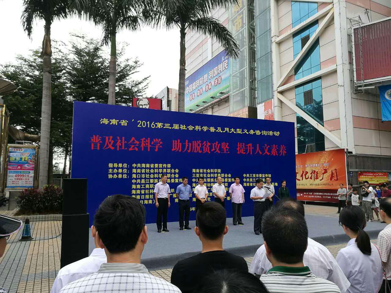 2016年11月20日上午,由海南省委宣传部指导,省社科联、社科院主办的第三届社会科学普及月在海口市明珠广场举行开幕仪式。开幕式由省社科联专职副主席、省社科院副院长詹兴文主持。海南省社科联党组书记、主席,省社科院院长张作荣在致辞中指出,本届社科普及月以“普及社会科学、助力脱贫攻坚、提升人文素养”为主题,突出宣传党的十八届六中全会精神和服务脱贫攻坚两大重点,发挥社科界智力集中、人才荟萃的优势,通过举办“理论宣讲、专题研讨、知识竞赛、图片展、技艺传习、文艺汇演、传统文化展示”等多样更贴需求、更接地气的活动,在求实效见实绩上下足功夫。