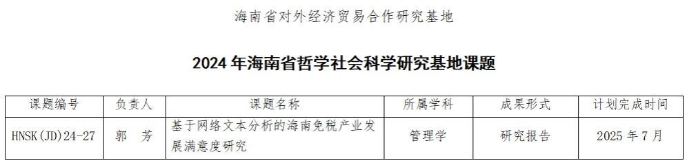 经海南省社科联组织专家开展评审、省社科联党组审定,并经网上公开向社会进行公示,我院(基地)推荐报送的郭芳老师主持的课题“基于网络文本分析的海南免税产业发展满意度研究(HNSK(JD)24-27)”喜获立项,基地将根据学院相关文件规定给予经费支持以开展项目研究。