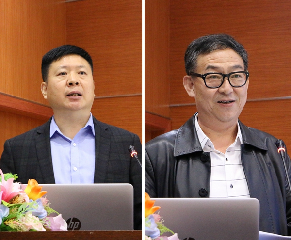 江西外语外贸职业学院院长黄明忠、青岛外事服务职业学校副校长迟圣德作经验交流