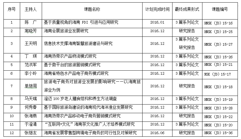 经基地领导鼎力支持和基地老师积极申报海南省哲学社会科学规划2015年研究基地课题,我基地陈广老师主持的“基于质量视角的海南 FDI 引进与应用研究”等12项课题获审批立项。
