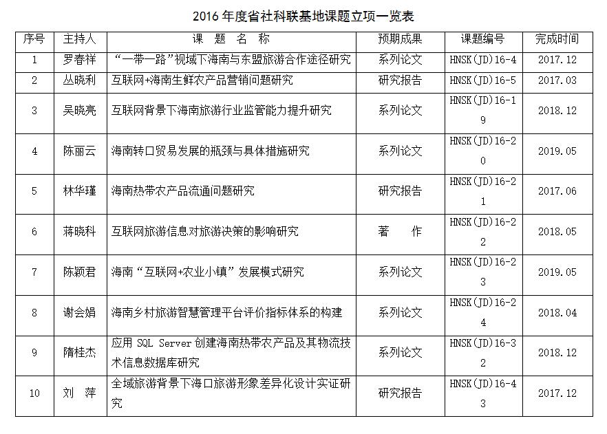海南省哲学社会科学规划2016年研究基地课题(第二批),经省社科联组织专家评审,有11项课题获省社科联立项资助。此次,海南省对外经济贸易合作研究基地隋桂杰主持的“应用SQL Server创建海南热带农产品及其物流技术信息数据库研究”和刘萍老师主持的“全域旅游背景下海口旅游形象差异化设计实证研究”课题喜获立项。