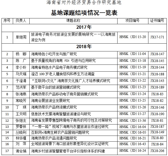 各结项基地课题成果介绍,请登录“海南省对外经济贸易合作研究基地”(http:/zxzx.html)网页了解。参考引用请注明出处,项目研究及成果应用请联系基地办公室。