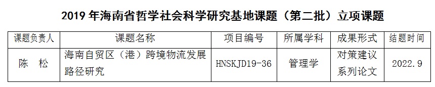 经海南省社科联组织专家开展评审、省社科联党组审定,并经网上公开向社会进行公示,2019年海南省哲学社会科学研究基地课题(第二批)全省共立项32项(其中:24项资助、8项自筹),我院(基地)推荐报送的陈松老师主持的课题“海南自贸区(港)跨境物流发展路径研究(HNSKJD19-36)”喜获立项,省社科联资助研究经费贰万元,学院将给予1:1配套研究经费支持开展项目研究。