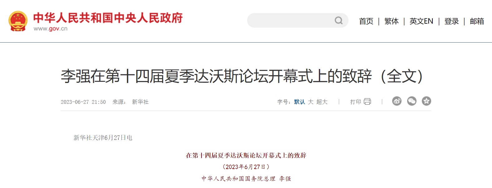 李强在第十四届夏季达沃斯论坛开幕式上的致辞(全文)