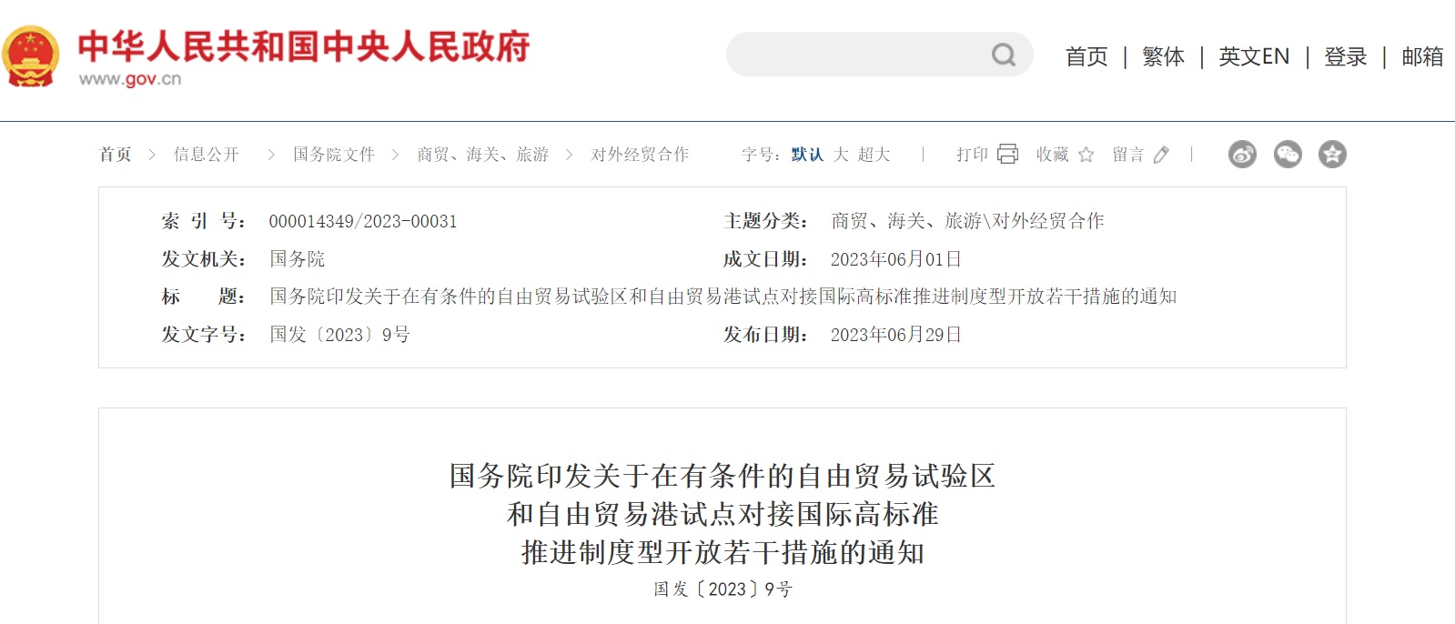 《关于在有条件的自由贸易试验区和自由贸易港试点对接国际高标准推进制度型开放若干措施》(国发〔2023〕9号)