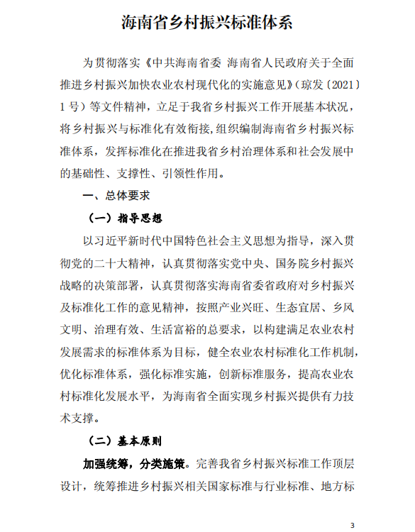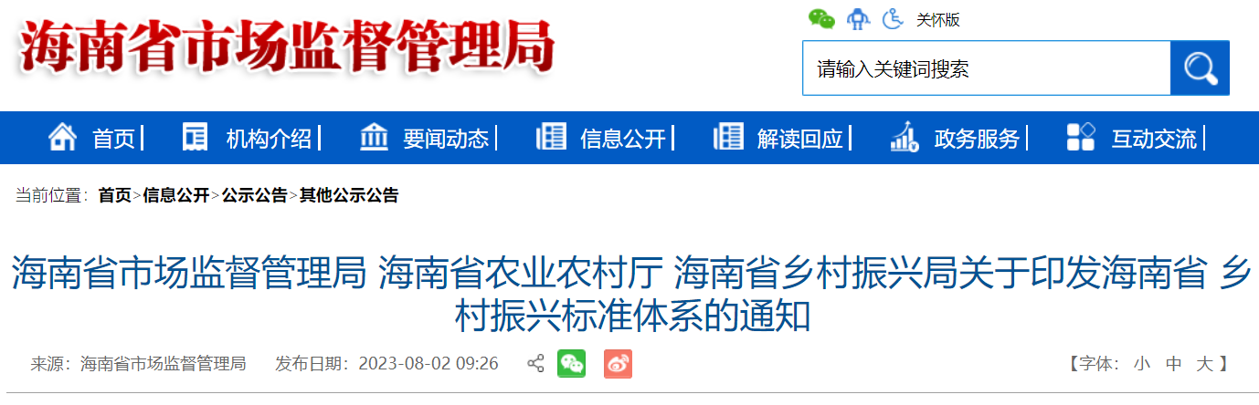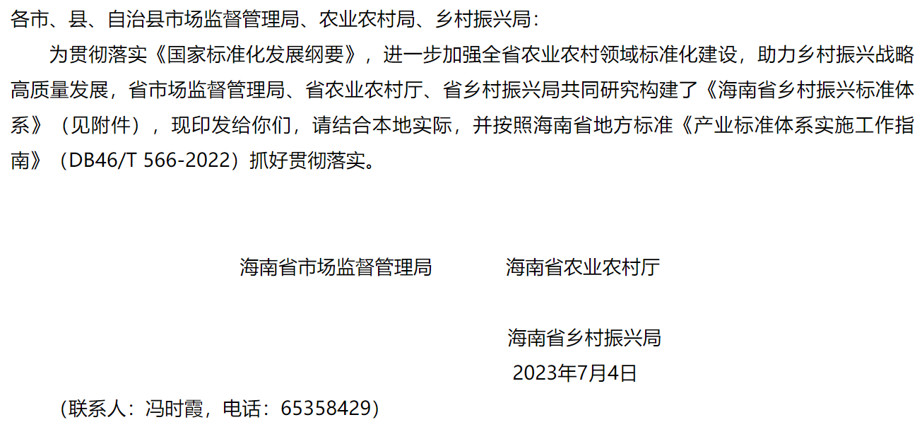 海南省市场监督管理局 海南省农业农村厅 海南省乡村振兴局印发《海南省乡村振兴标准体系》