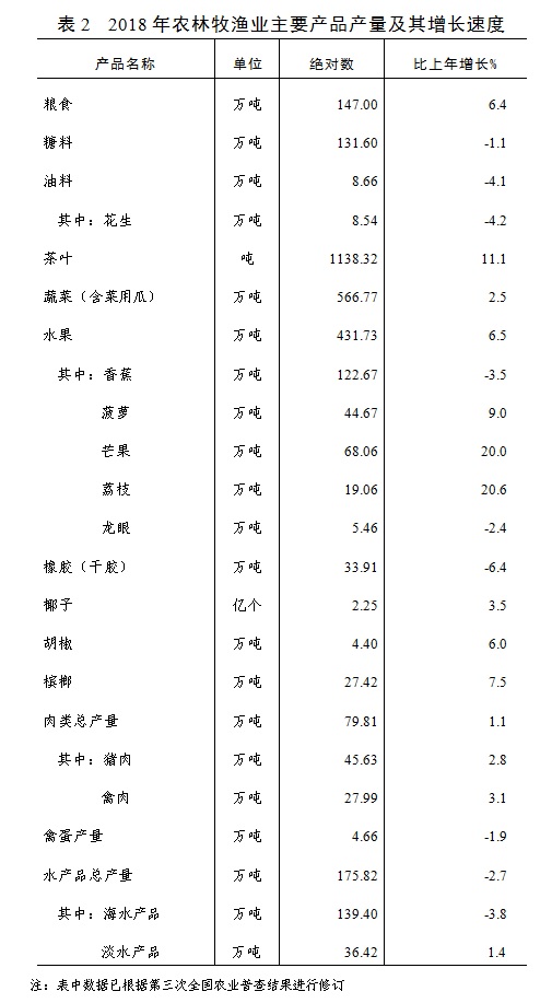 全年全省农林牧渔业完成增加值1034.44亿元,比上年增长4.1%。分行业看,农业完成增加值499.88亿元,比上年增长5.0%。蔬菜(含菜用瓜)收获面积386.59万亩,增长1.9%;产量566.77万吨,增长2.5%。水果收获面积277.82万亩,增长7.5%;产量431.73万吨,增长6.5%。林业完成增加值70.89亿元,比上年增长6.8%。干胶产量33.91万吨,下降6.4%。牧业完成增加值146.28亿元,比上年增长3.9%。肉类总产量79.81万吨,增长1.1%。渔业完成增加值283.06亿元,比上年增长1.2%。水产品总产量175.82万吨,比上年下降2.7%。农林牧渔专业及辅助性活动完成增加值34.33亿元,比上年增长10.0%。农林牧渔业主要产品产量及其增长速度见表2。