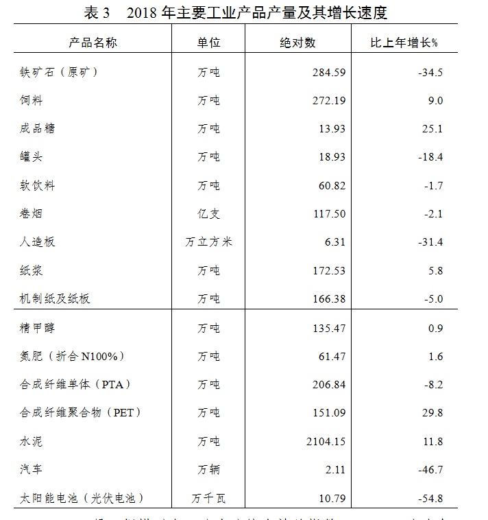 在八大工业支柱行业增加值中,农副食品加工业比上年增长1.8%,造纸及纸制品业下降2.6%,石油加工业增长12.9%,化学原料和化学制品制造业增长0.5%,医药制造业增长15.9%,非金属矿物制品业增长4.8%,汽车制造业下降33.2%,电力、热力的生产和供应业增长6.5%。主要工业产品产量及其增长速度见表3。