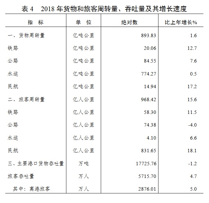 全年全省交通运输、邮政仓储业实现增加值291.73亿元,比上年增长12.5%。各种运输方式完成货物和旅客周转量、吞吐量及其增长速度见表4。