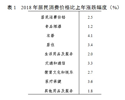 全年全省居民消费价格(CPI)比上年上涨2.5%。其中,衣着价格上涨4.1%,涨幅居八大类之首;其次是医疗保健价格上涨3.6%。商品零售价格上涨2.5%,农业生产资料价格上涨2.2%,工业生产者出厂价格上涨8.2%,工业生产者购进价格上涨10.8%,固定资产投资价格增长6.2%。居民消费价格比上年涨跌幅度见表1。
