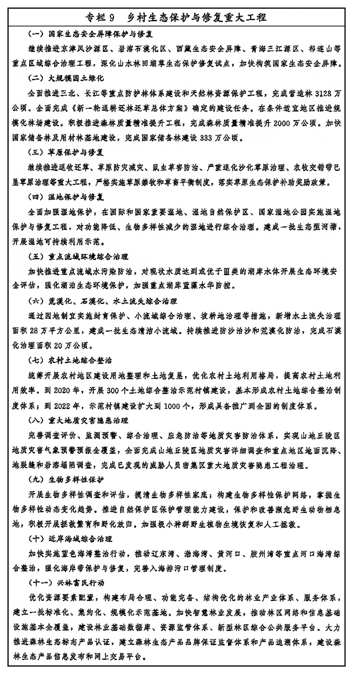 统筹山水林田湖草系统治理,优化生态安全屏障体系。大力实施大规模国土绿化行动,全面建设三北、长江等重点防护林体系,扩大退耕还林还草,巩固退耕还林还草成果,推动森林质量精准提升,加强有害生物防治。稳定扩大退牧还草实施范围,继续推进草原防灾减灾、鼠虫草害防治、严重退化沙化草原治理等工程。保护和恢复乡村河湖、湿地生态系统,积极开展农村水生态修复,连通河湖水系,恢复河塘行蓄能力,推进退田还湖还湿、退圩退垸还湖。大力推进荒漠化、石漠化、水土流失综合治理,实施生态清洁小流域建设,推进绿色小水电改造。加快国土综合整治,实施农村土地综合整治重大行动,推进农用地和低效建设用地整理以及历史遗留损毁土地复垦。加强矿产资源开发集中地区特别是重有色金属矿区地质环境和生态修复,以及损毁山体、矿山废弃地修复。加快近岸海域综合治理,实施蓝色海湾整治行动和自然岸线修复。实施生物多样性保护重大工程,提升各类重要保护地保护管理能力。加强野生动植物保护,强化外来入侵物种风险评估、监测预警与综合防控。开展重大生态修复工程气象保障服务,探索实施生态修复型人工增雨工程。