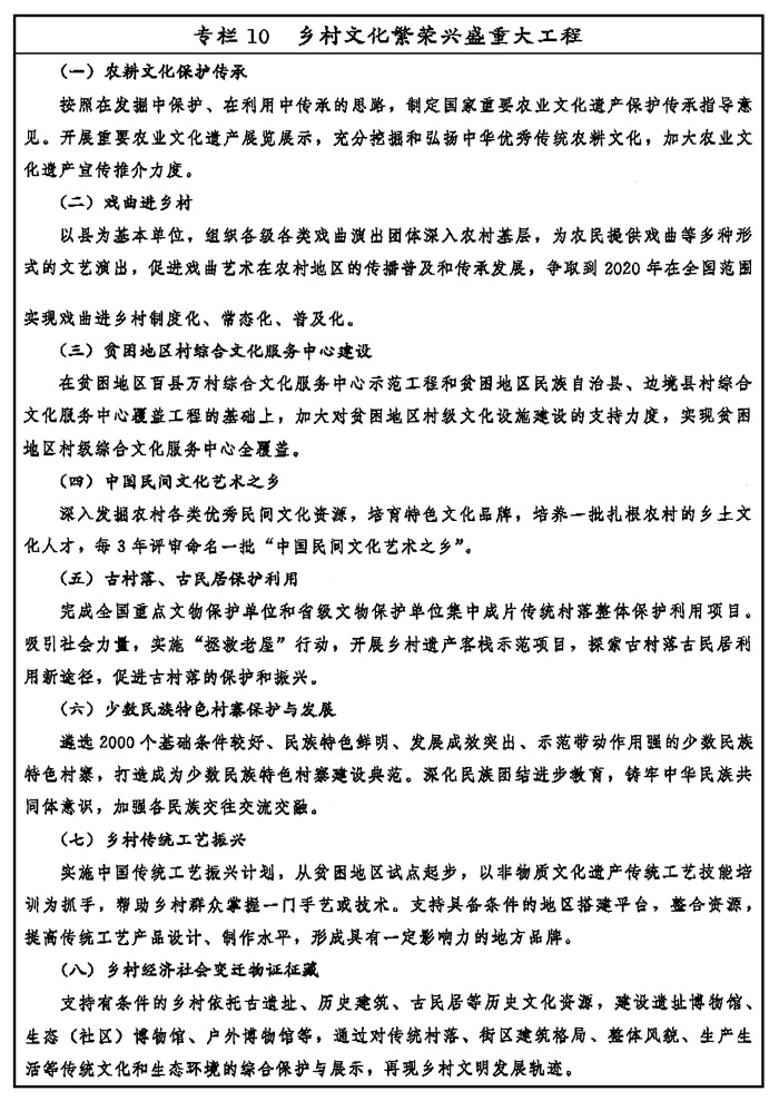 实施农耕文化传承保护工程,深入挖掘农耕文化中蕴含的优秀思想观念、人文精神、道德规范,充分发挥其在凝聚人心、教化群众、淳化民风中的重要作用。划定乡村建设的历史文化保护线,保护好文物古迹、传统村落、民族村寨、传统建筑、农业遗迹、灌溉工程遗产。传承传统建筑文化,使历史记忆、地域特色、民族特点融入乡村建设与维护。支持农村地区优秀戏曲曲艺、少数民族文化、民间文化等传承发展。完善非物质文化遗产保护制度,实施非物质文化遗产传承发展工程。实施乡村经济社会变迁物证征藏工程,鼓励乡村史志修编。