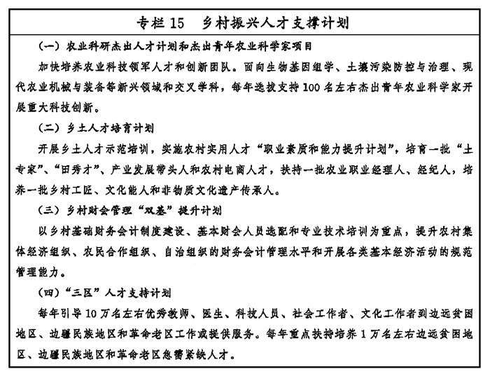 建立健全激励机制,研究制定完善相关政策措施和管理办法,鼓励社会人才投身乡村建设。以乡情乡愁为纽带,引导和支持企业家、党政干部、专家学者、医生教师、规划师、建筑师、律师、技能人才等,通过下乡担任志愿者、投资兴业、行医办学、捐资捐物、法律服务等方式服务乡村振兴事业,允许符合要求的公职人员回乡任职。落实和完善融资贷款、配套设施建设补助、税费减免等扶持政策,引导工商资本积极投入乡村振兴事业。继续实施“三区”(边远贫困地区、边疆民族地区和革命老区)人才支持计划,深入推进大学生村官工作,因地制宜实施“三支一扶”、高校毕业生基层成长等计划,开展乡村振兴“巾帼行动”、青春建功行动。建立城乡、区域、校地之间人才培养合作与交流机制。全面建立城市医生教师、科技文化人员等定期服务乡村机制。