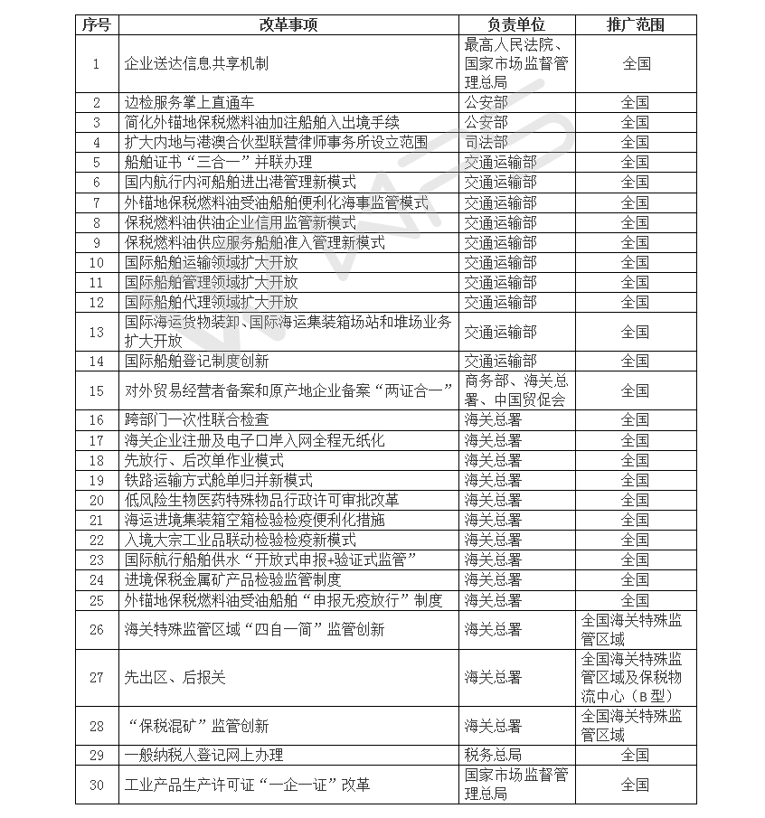 4.事中事后监管措施:“企业送达信息共享机制”、“边检服务掌上直通车”、“简化外锚地保税燃料油加注船舶入出境手续”、“国内航行内河船舶进出港管理新模式”、“外锚地保税燃料油受油船舶便利化海事监管模式”、“保税燃料油供油企业信用监管新模式”、“海关企业注册及电子口岸入网全程无纸化”等7项。