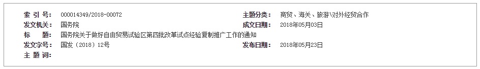 建设自由贸易试验区(以下简称自贸试验区)是党中央、国务院在新形势下全面深化改革和扩大开放的战略举措。按照党中央、国务院部署,11个自贸试验区所在省市和有关部门结合各自贸试验区功能定位和特色特点,全力推进制度创新实践,形成了自贸试验区第四批改革试点经验,将在全国范围内复制推广。现将有关事项通知如下: