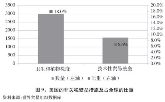 根据世界贸易组织统计,美国当前已通报的卫生和植物检疫以及技术性贸易壁垒措施分别有3004项和1574项,占全球的比重分别高达18%和6.6%(图9)。联合国贸发组织2018年6月29日的报告《对贸易监管数据的分析揭露新的重大发现》中提到,要把一棵树进口到美国,需满足54项卫生和植物检疫措施相关要求。这些措施严重影响了货物通关效率,增加了贸易成本。