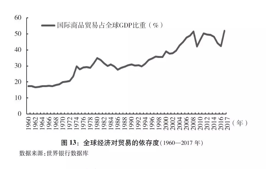 ▲ 图表:图13:全球经济对贸易的依存度(1960—2017年) 新华社发