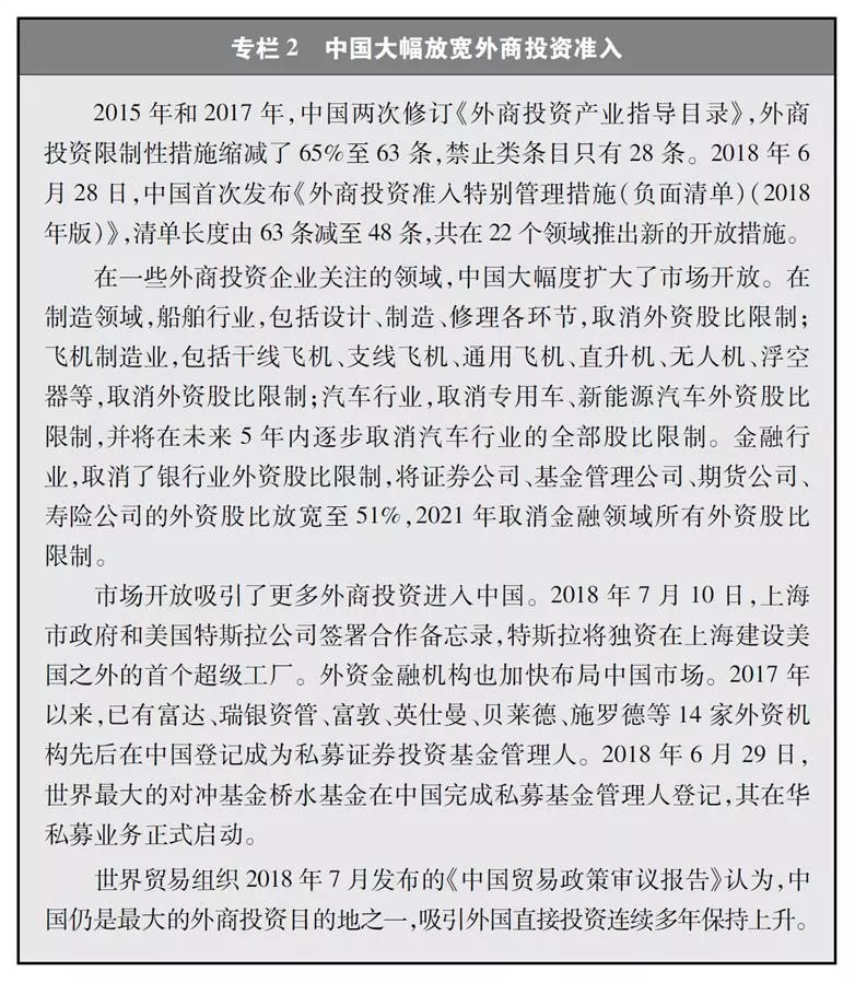 除此之外,中国在某些领域的股权合作符合中国的国际义务、各国惯例和实践,不能被混淆为“强制技术转让”。而且,近几年中国对外商投资的股权限制不断放开,外国企业自由选择权不断扩大(专栏2)。在此过程中,中外企业股权合作仍然不断深化,完全是双方基于商业原因的自由选择。