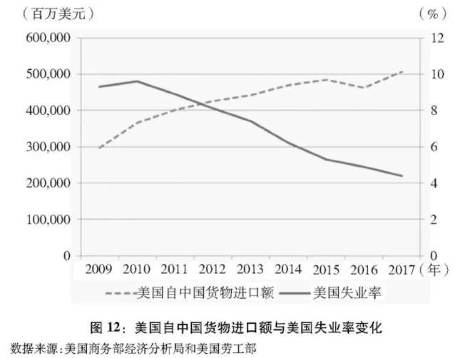 美国将国内政策失误和制度缺陷导致的失业问题错误归因于国际贸易。美国政府认为他国通过不公平贸易的方式抢夺了本国就业岗位,作为美国贸易逆差最大来源国,中国首当其冲成为主要的被指责对象。事实是,根据联合国数据,2001-2017年,中美贸易额增长了4.4倍,但美国失业率则从5.7%下降到4.1%。尤其是2009年以来,美国从中国进口快速增长,同期美国失业率反而呈现出持续下降的态势,美国政府指责的货物进口和失业率之间的替代关系并不存在(图12)。2017年美国国会研究中心报告显示,2010-2015年,尽管美国制造业从中国进口整体增加32.4%,美国制造业的工作机会反而增加了6.8%。