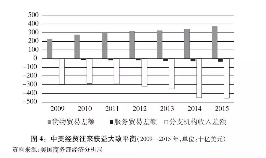 在经济全球化深入发展、国际化生产普遍存在的今天,双边经贸关系内涵早已超出货物贸易,服务贸易和本国企业在对方国家分支机构的本地销售额(即双向投资中的本地销售)也应考虑进来。综合考虑货物贸易、服务贸易和本国企业在对方国家分支机构的本地销售额三项因素,中美双方经贸往来获益大致平衡,而且美方净收益占优(图4)。根据中国商务部统计,2017年美国对华服务贸易顺差为541亿美元,美国在服务贸易方面占有显著优势。根据美国商务部经济分析局数据,2015年美资企业在华销售额高达4814亿美元,远高于中资企业在美256亿美元的销售额,美国占有4558亿美元的优势,美国企业跨国经营优势更为突出。2018年6月德意志银行发布的研究报告《估算美国和主要贸易伙伴之间的经济利益》认为,从商业利益角度分析,考虑到跨国公司的全球经营对双边经贸交往的影响,美国实际上在中美双边贸易交往过程中获得了比中国更多的商业净利益。根据其计算,扣除各自出口中其他国家企业子公司的贡献等,2017年美国享有203亿美元的净利益。