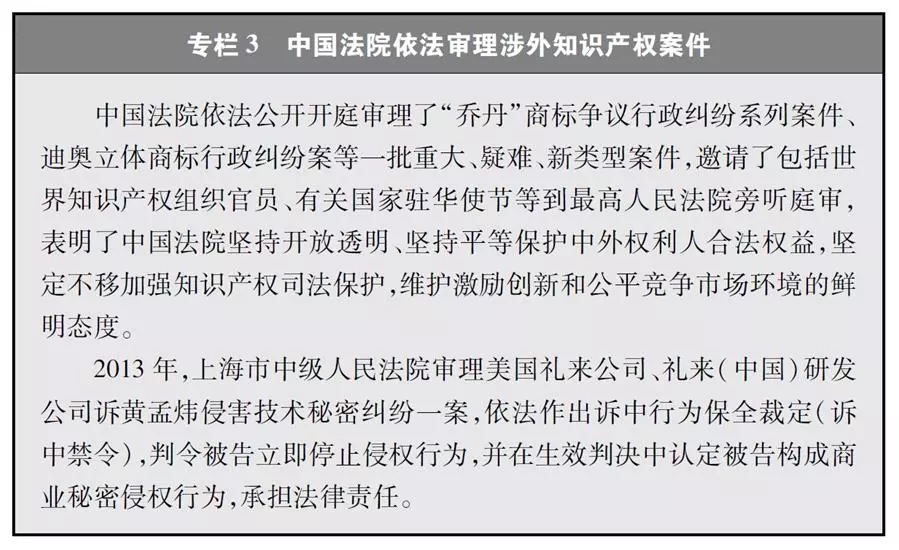 加强知识产权司法保护,充分发挥司法保护主导作用。2014年,中国在北京、上海、广州设立了专门的知识产权法院,跨区域管辖专利等知识产权案件。自2009年以来,中国共设立了天津、南京、苏州、武汉、西安等16个知识产权法庭,有效提升了知识产权专业化审判水平。2013年至2017年,中国法院共新收各类知识产权案件813564件,审结781257件。2017年,中国法院共新收一审知识产权案件213480件,结案202970件,分别比上年增加46%和43%。中国已经成为世界上审理知识产权案件尤其是专利案件最多的国家。中国依法平等保护中外当事人合法权益。2016年,中国法院共审结涉外知识产权民事一审案件1667件,同比上升25.6%(专栏3)。中国处理涉外知识产权案件的审理周期是全世界最短的之一,北京知识产权法庭平均为4个月。由于司法程序快捷,目前中国法院已被国际上视为知识产权诉讼较为可取的诉讼地,北京知识产权法院受理的案件中有相当一部分双方当事人都是外国人。