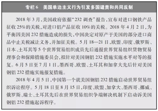 对多国产品开展“232调查”。美国政府滥用“国家安全”概念推行贸易保护措施。2017年4月,美国政府依据本国《1962年贸易扩展法》第232条款,以所谓“国家安全”为由对包括中国在内的全球主要经济体的钢铁和铝产品发起“232调查”,并依据单方面调查结果,于2018年3月宣布对进口钢铁和铝分别加征25%和10%的关税,招致各方普遍反对和报复。2018年4月5日,中国率先将美国钢铝232措施诉诸世界贸易组织。美国宣布自6月1日恢复对欧盟钢铝产品加征关税后,欧盟也予以反击并向世界贸易组织申诉,指责美国的措施违反世界贸易组织规则。欧盟贸易专员马姆斯特罗姆称,美国正在进行“危险游戏”,欧盟如不作回应将等同于接受这些非法关税。截至2018年8月,已有9个世界贸易组织成员向世界贸易组织起诉美国钢铝232措施。2018年7月,美国政府又以所谓“国家安全”为由,对进口汽车及零配件发起新的“232调查”。