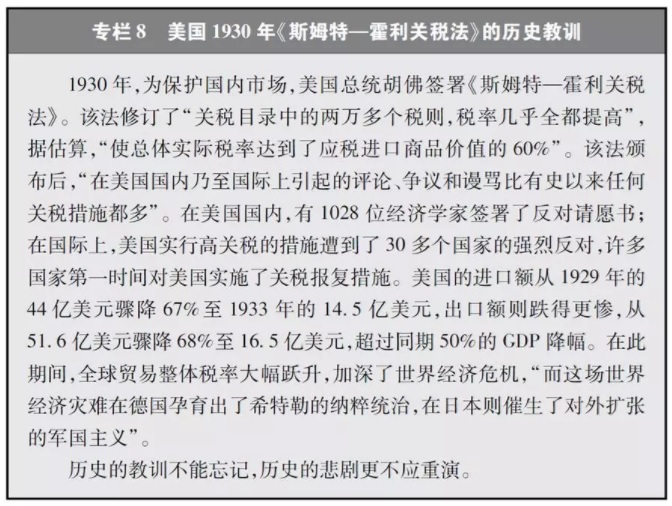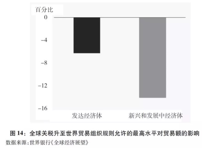 世界银行2018年6月5日发布的《全球经济展望》报告指出,全球关税广泛上升将会给全球贸易带来重大负面影响,至2020年全球贸易额下降可达9%,对新兴市场和发展中经济体的影响尤为明显,特别是那些与美国贸易或金融市场关联度较高的经济体(图14)。世界贸易组织总干事罗伯特·阿泽维多表示,若关税回到关税总协定/世界贸易组织之前的水平,全球经济将立即收缩2.5%,全球贸易量削减60%以上,影响将超过2008年国际金融危机。贸易战对所有人都有害,特别是穷人将损失63%的购买力。历史教训一再表明,贸易战没有赢家,甚至会给世界和平和发展带来严重影响(专栏8)。