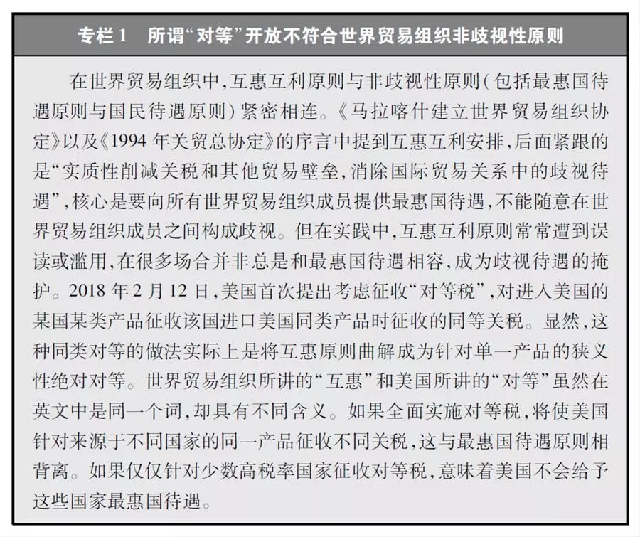 世界贸易组织所提倡的互惠互利原则,考虑了各国发展阶段的差别。在世界贸易组织框架下,发展中成员享有差别和更优惠待遇。这种制度安排是在尊重发展中国家和地区发展权的基础上,积极吸纳新的发展中成员加入,以扩大成员数量、增强多边体制的包容性,也体现了以当期优惠换取后期开放的互惠原则。对于发展中成员而言,由于其处于发展初期阶段,需要对产业适度保护以促进良性发展,其市场随经济发展扩大后,也将为发达国家带来更多商业机会。发展中成员享有差别和更优惠待遇,符合包括发达成员在内的各国各地区长期利益,这种制度安排是真正意义上的国际公平。2001年,中国通过多边谈判以发展中成员身份加入世界贸易组织,享受发展中成员待遇。十几年来,中国经济实现了快速发展,但仍然是一个发展中国家。由于中国有13.9亿人口,经济总量数据显得较为庞大,但这没有改变人均发展水平较低的现实。根据国际货币基金组织数据,2017年中国人均国内生产总值8643美元,仅为美国的14.5%,排在世界第71位。2017年末中国还有3046万农村贫困人口。仅以中国经济和贸易总规模较大为依据,要求中国和美国实现关税绝对对等是不合理的。美国追求绝对对等的做法,违背了世界贸易组织最惠国待遇和非歧视性原则(专栏1)。