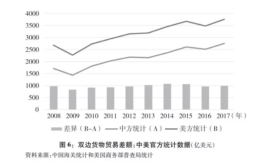 此外,美国统计方法相对高估了中美货物贸易逆差额。中美双方的统计差异长期存在,且差异较大。2017年,中国统计对美货物贸易顺差为2758亿美元,美国统计对华逆差接近3958亿美元,相差1000亿美元左右。由中美两国商务部相关专家组成的统计工作组,每年就中美贸易统计差异进行一次比较研究。根据该工作组测算,美国官方统计的对华贸易逆差每年都被高估20%左右。根据中国海关和美国商务部普查局的统计,双方统计结果在最近十年来的走势和变动幅度大致相同(图6)。引起差异的原因包括进口价格和出口价格之间的差异、转口贸易增值、直接贸易加价、地理辖区、运输时滞等。